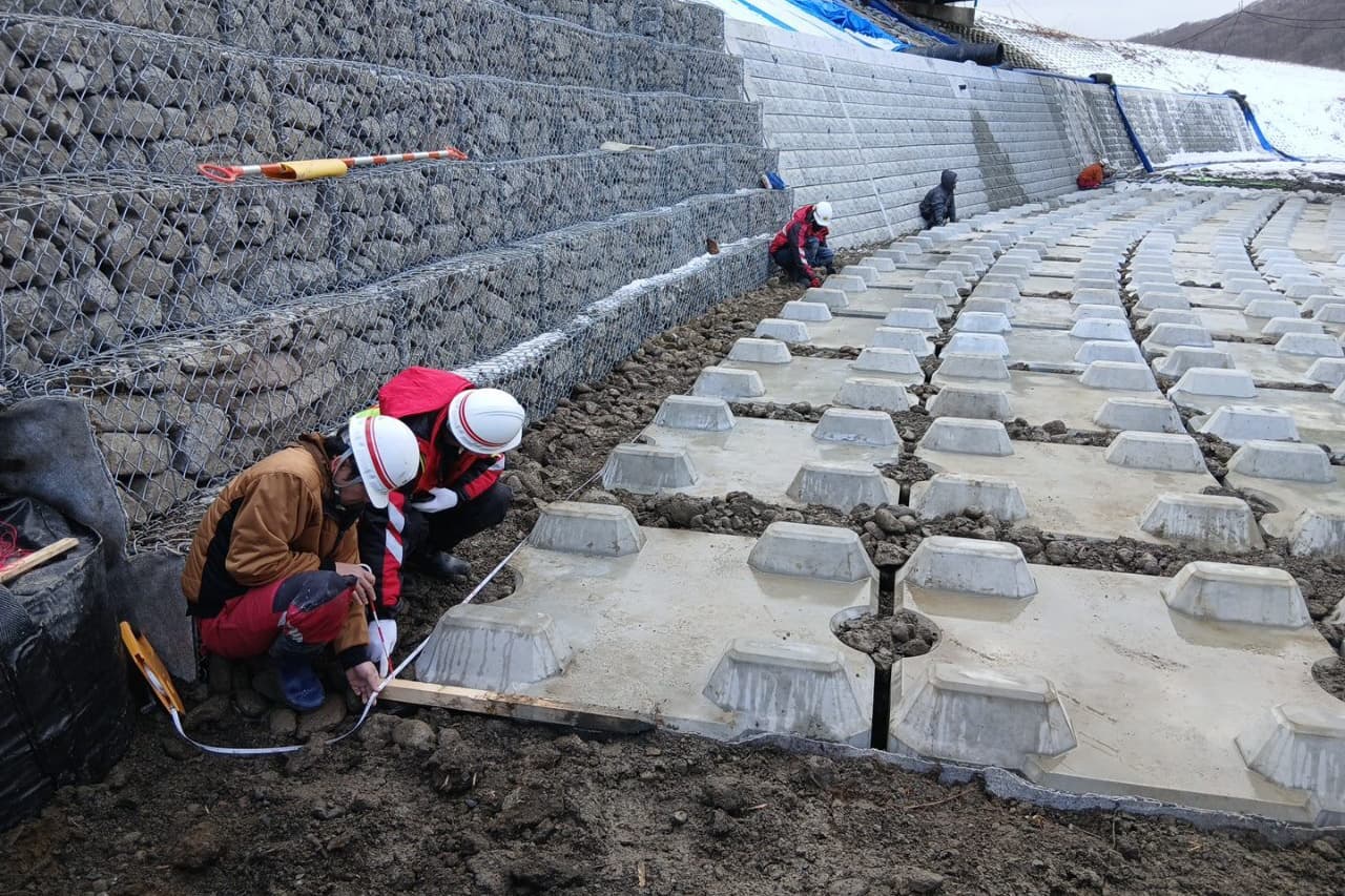 着工時に撤去した既設ブロックのうち再利用可能なものは法面下部に再設置し、不足分については新規ブロックで補いました。
