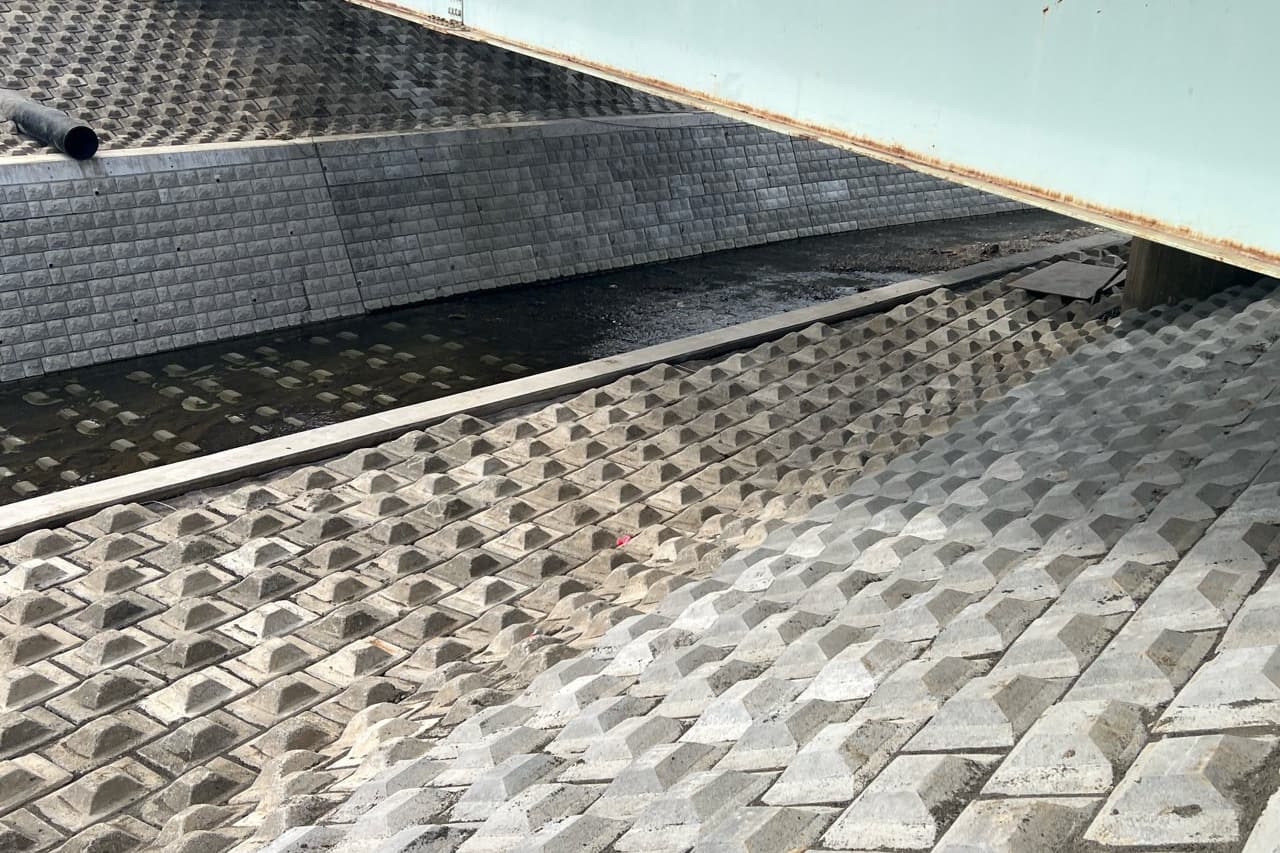 - 連節ブロック:ブロック同士をワイヤーや金具でつなぎ、一体化させることで水の力や地震に強くした護岸用ブロック。これを設置する。