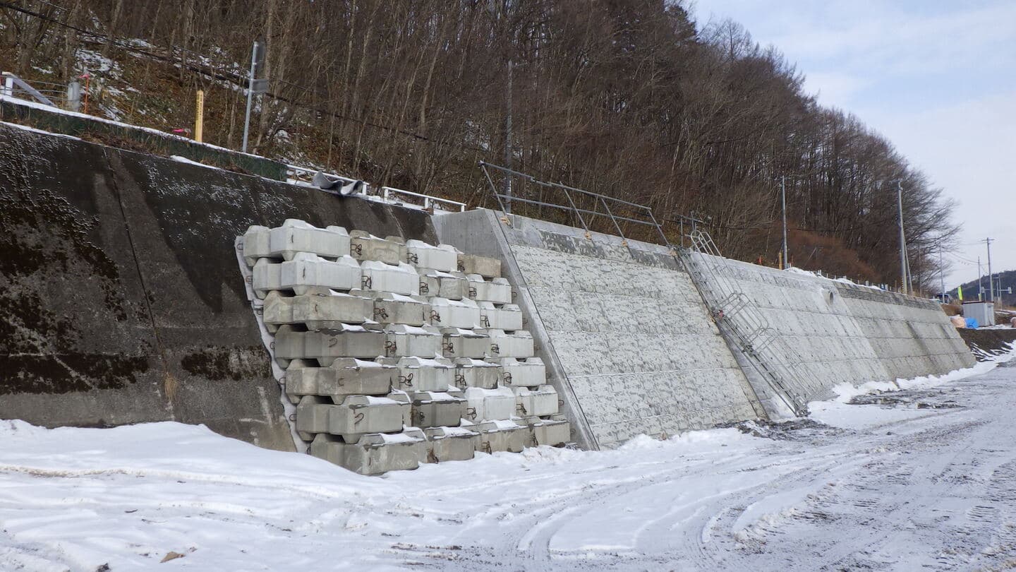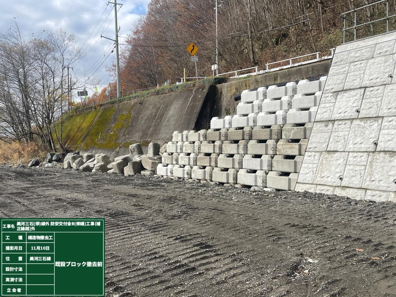 昨年までに施工した新設大型連接ブロックの末端部には、再利用可能な既存ブロックが仮置きされています。これらの既存ブロックを一時的に撤去し、新設する大型連接ブロックの施工位置を測量・整備します。