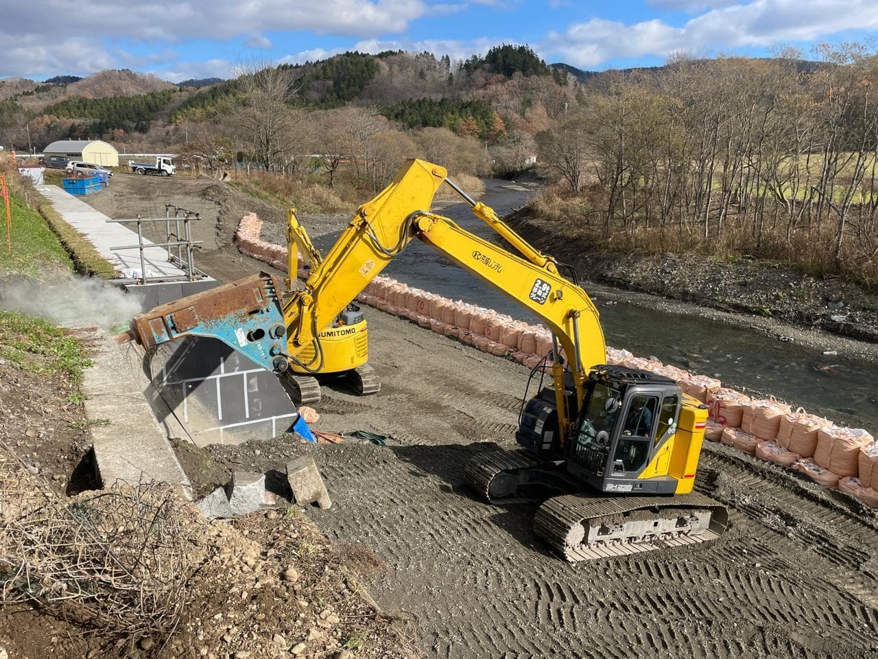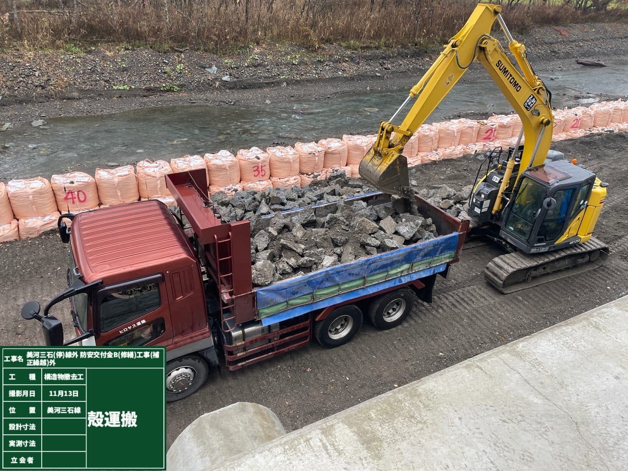 既存の大型土嚢袋を撤去し、ふとん籠を設置する場所を整える。