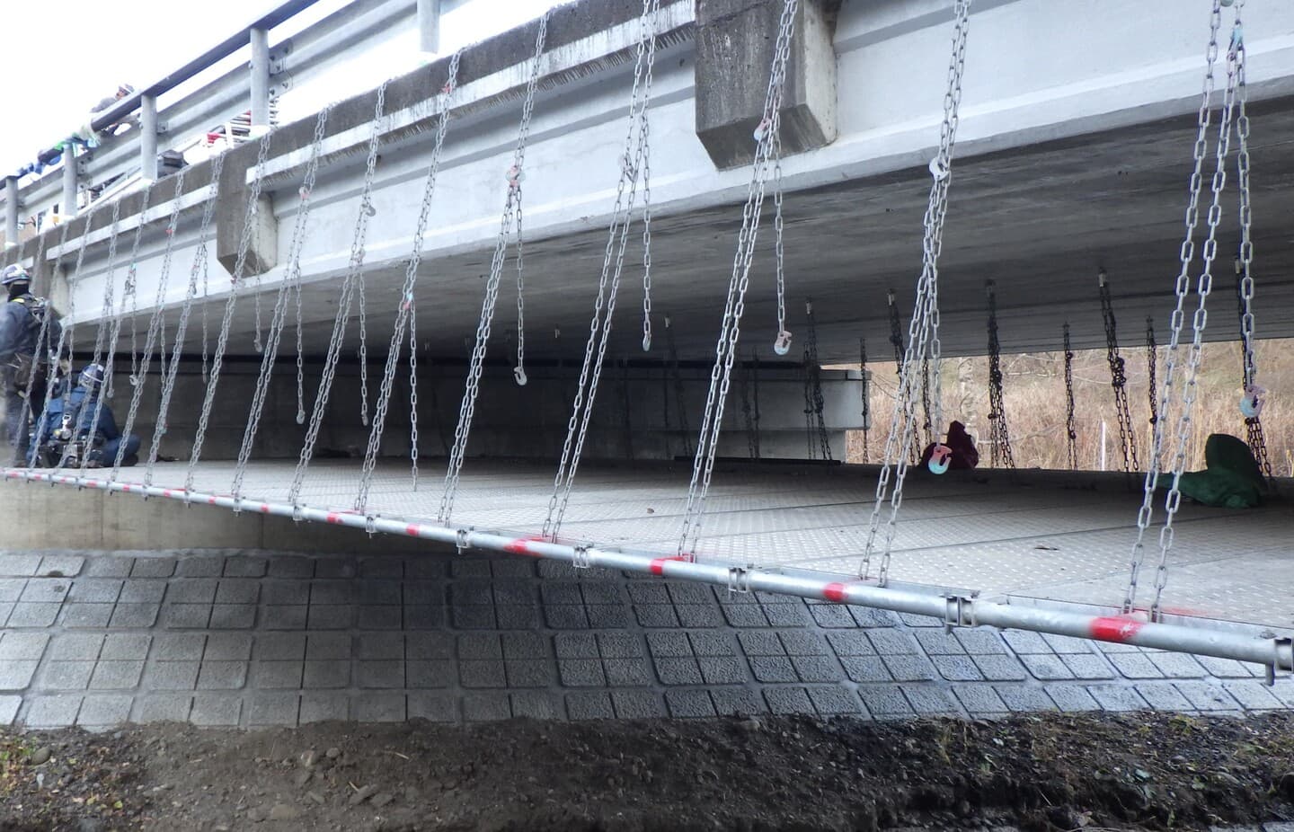 その際、しっかりとした足場が橋の真下に必要になります。川の水流・水圧に左右されず、河床を汚さず自然に配慮した吊足場がなくてはならない存在です。