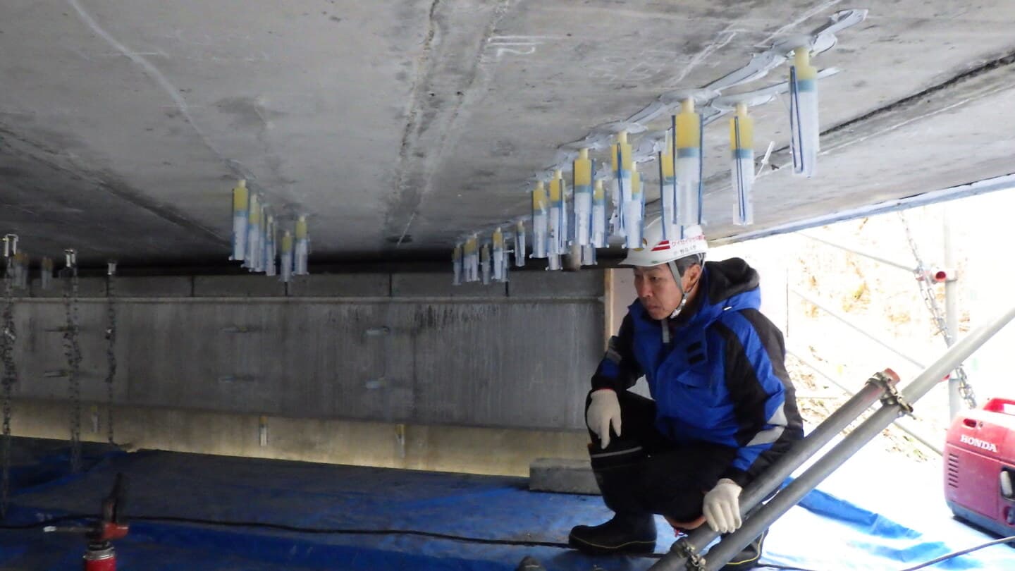 この工事での難関、橋桁裏のひび割れ部位への樹脂注入作業です。