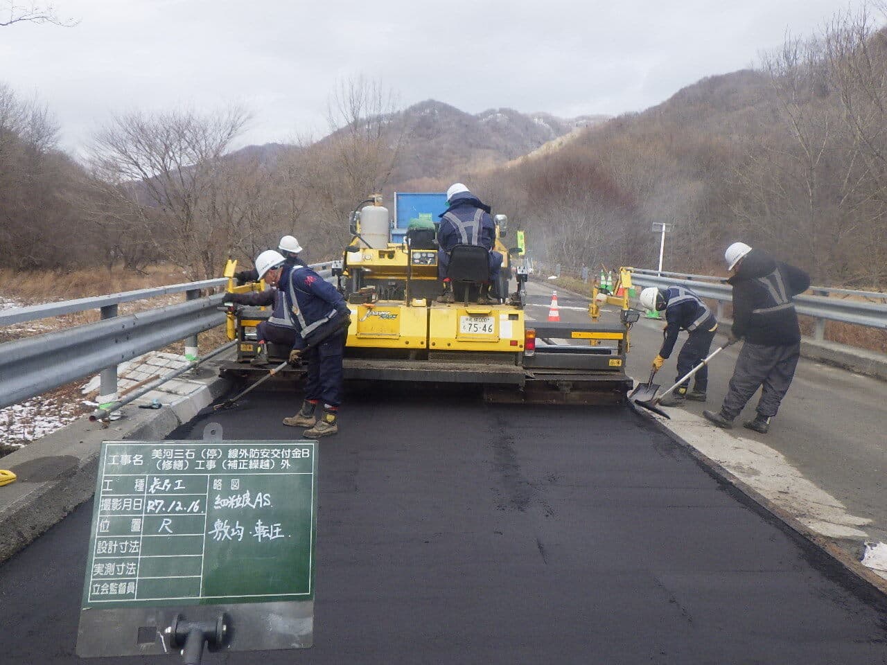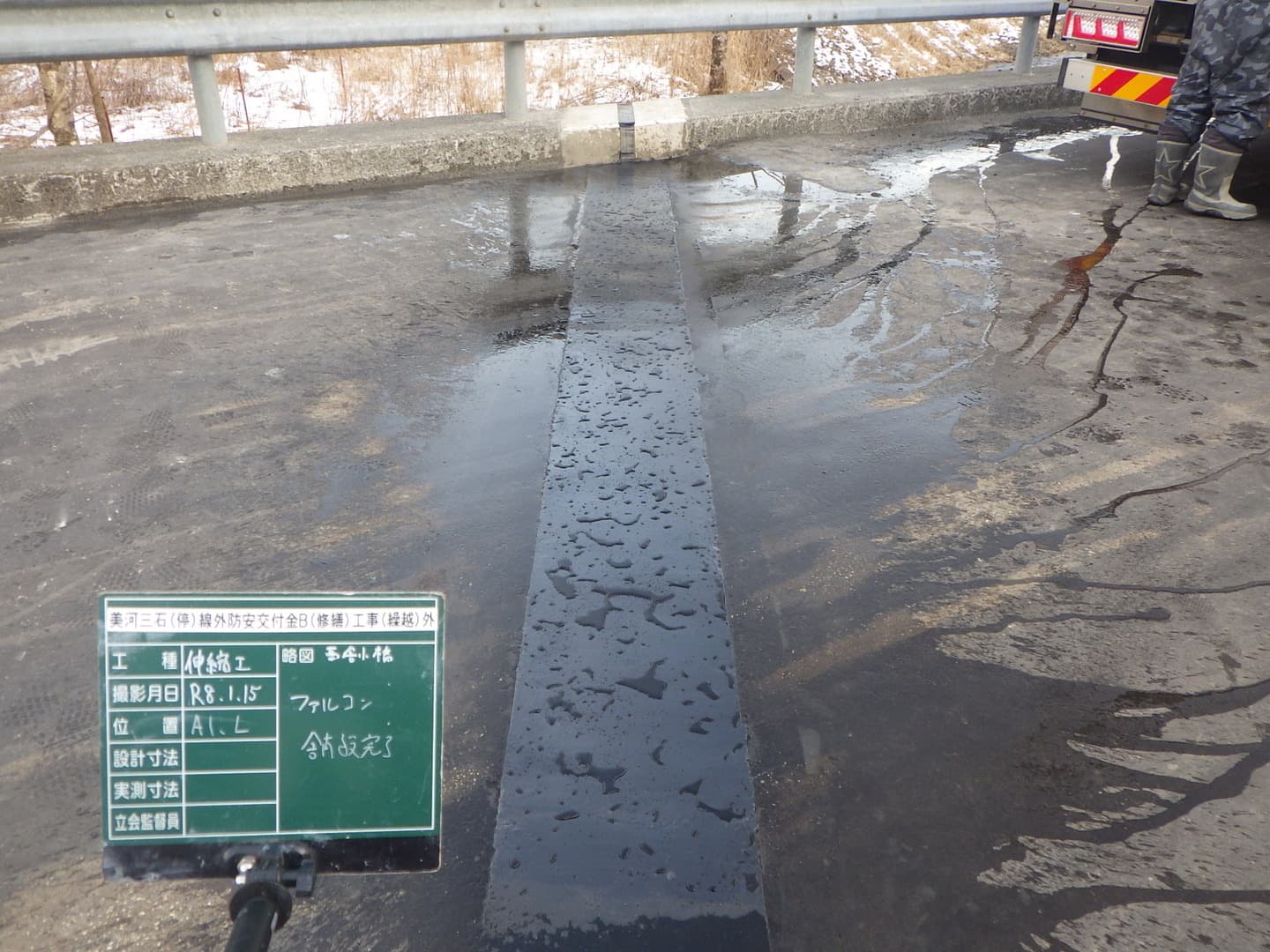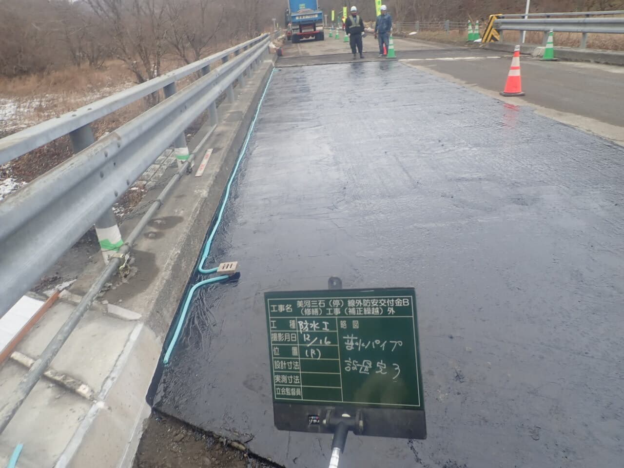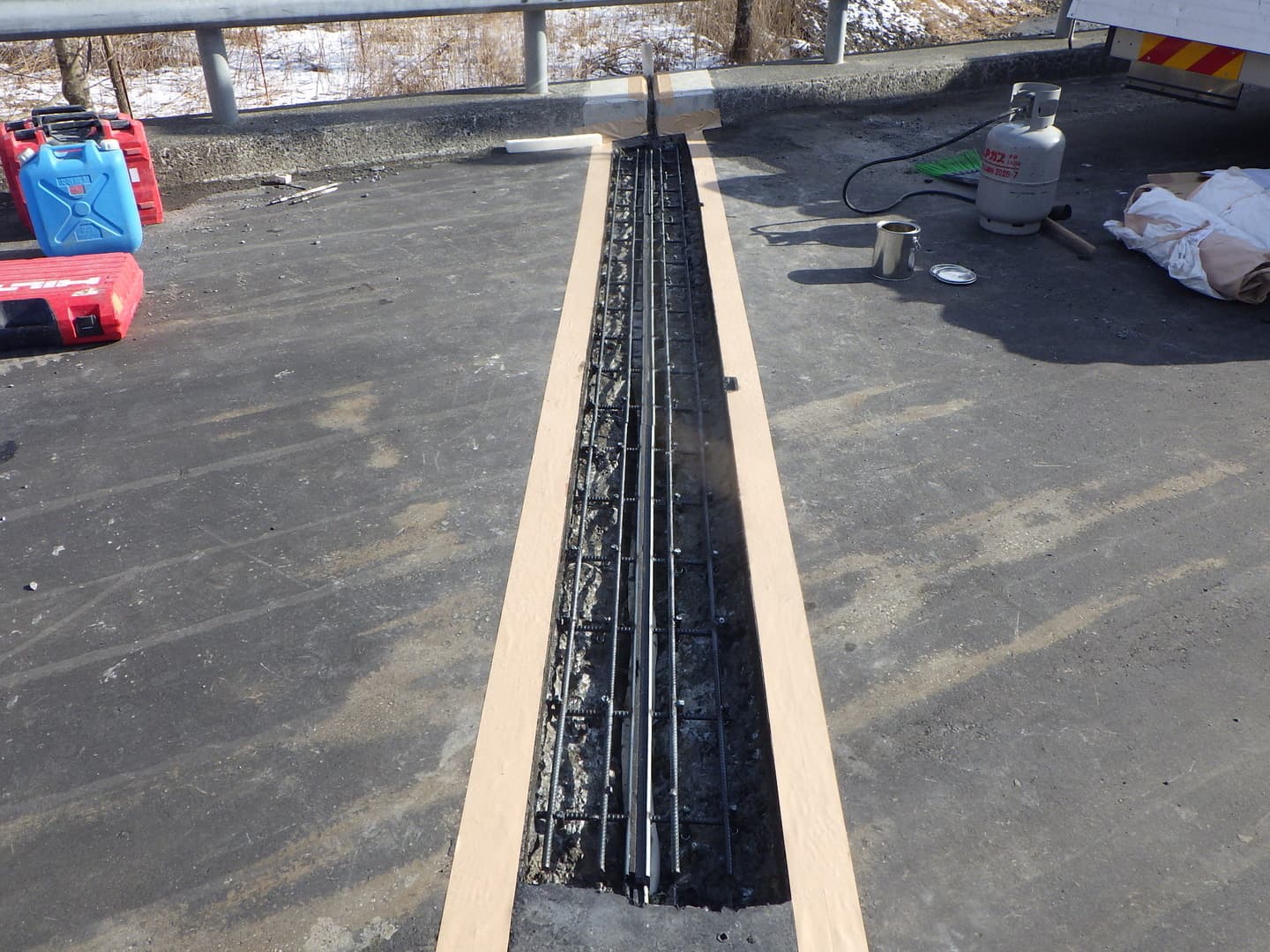 冬季の橋補修・舗装切削では、切削面の凍結による品質低下も起こりやすいです。気象情報を確認し凍結防止、資材の保温管理、作業員の転倒防止対策が重要になります。雪が降る前に無事に作業を終えられました。