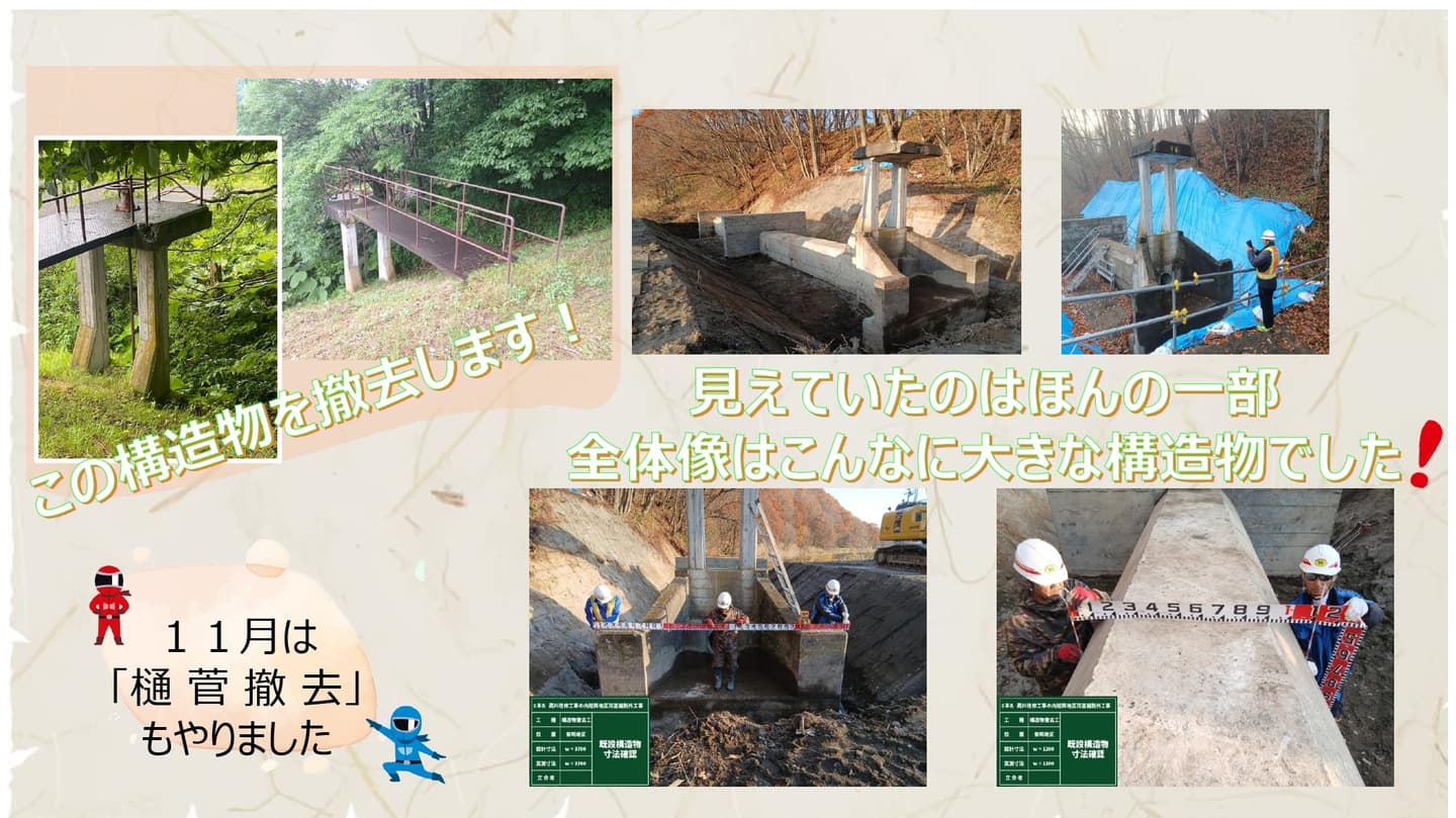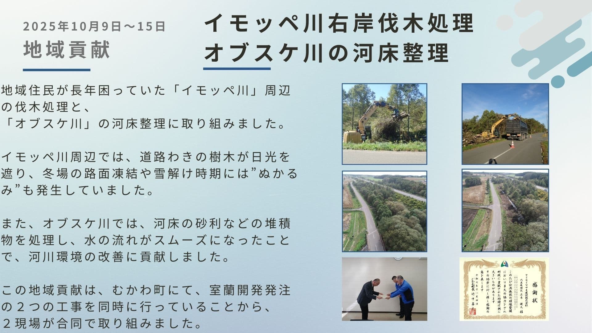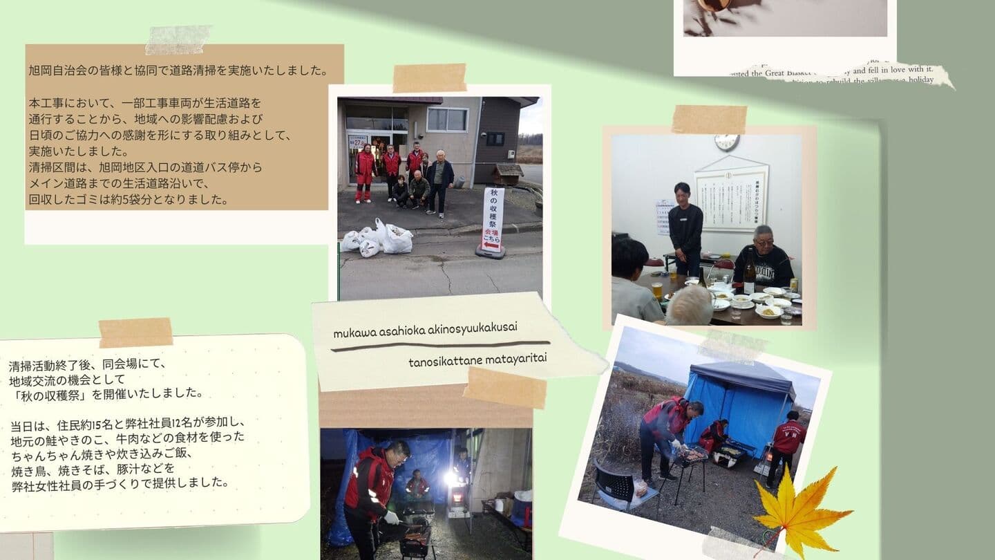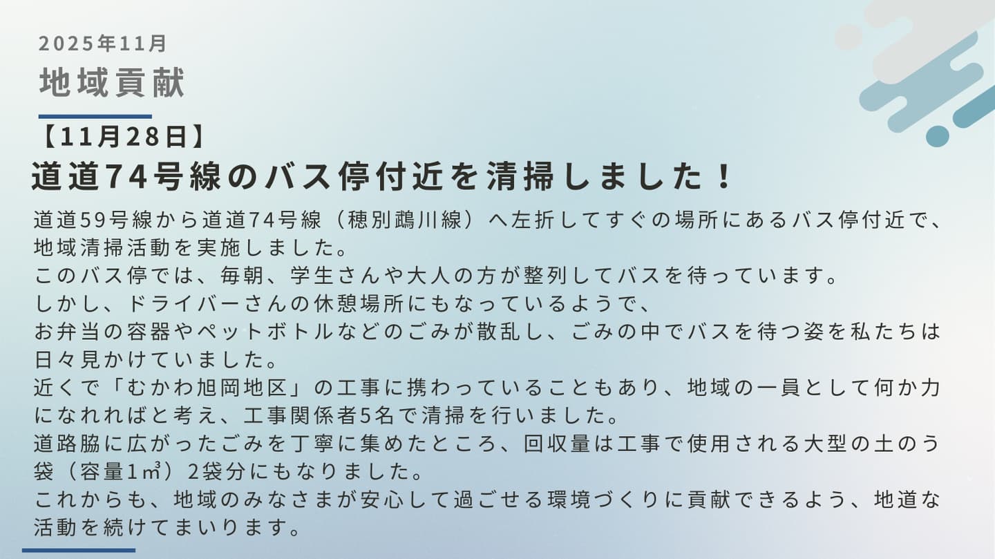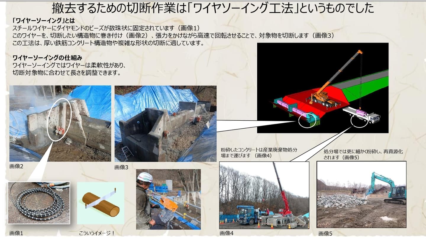 現場の取り組み Site Initiatives 本ページでは、工事の進捗とは別に、現場での工夫や地域との関わり、特徴的な施工について紹介しています。 【10月9日~15日】地域貢献 【10月28日】安全衛生教育をおこないました 日本に3台しかない「ワイヤーソー」を使って施工しました 11月は他の場所で構造物の撤去作業も行いました i-Construction 2.0 重機の遠隔操作デモンストレーション見学会を実施しました i-Construction 2.0 苫小牧民報と北海道通信に取り上げていただきました