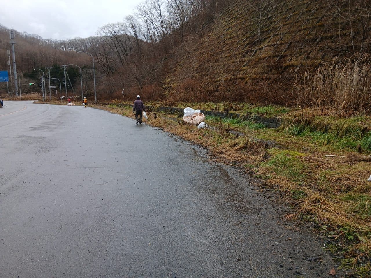 清掃区間は、旭岡地区入口の道道バス停からメイン道路までの生活道路沿いで、回収したゴミは約5袋分となりました。